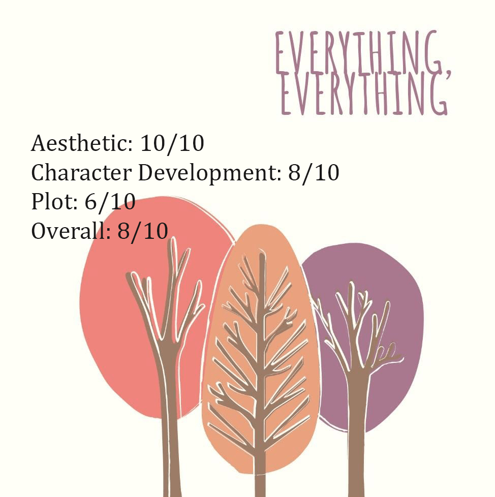 ‘Everything, Everything’ has many characters common with contemporary young adult books. Next-door quirky, cute guy, over-protective or aggressive parents. The protagonist undergoes a lot of development over the course of this book, changes which are even seen in her writings, how it turns from its initial goofy tones and short paragraphs to faster-to-the-point exposition and full- length chapters. Also, her interpretation of everything she does outside of her house is interesting to read, as it corresponds to her feeling those things for the first time in her life, and her naïve, childish explanations to the things she witnesses/undergoes. Other primary characters were also likeable, and were fun to read. But they do not undergo such huge character developments.