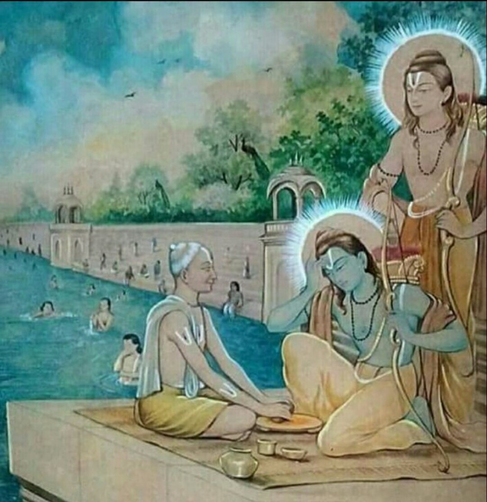 Tulsidas followed the instruction of Hanuman and started living in an Ashram at Ramghat in Chitrakuta. On a Wednesday morning on the new moon day of the month of Magha, Ram appeared in front of Tulsidas. Tulsidas was making sandalwood paste when a child came and asked for a sandalwood Tilak. This time Hanuman gave a hint to Tulsidas and he had a full view of Ram. Tulsidas was so charmed that he forgot about the sandalwood. Ram took the sandalwood paste and put a Tilak himself on his forehead and Tulsidas’ forehead before disappearing. This incident is described in the following verse: